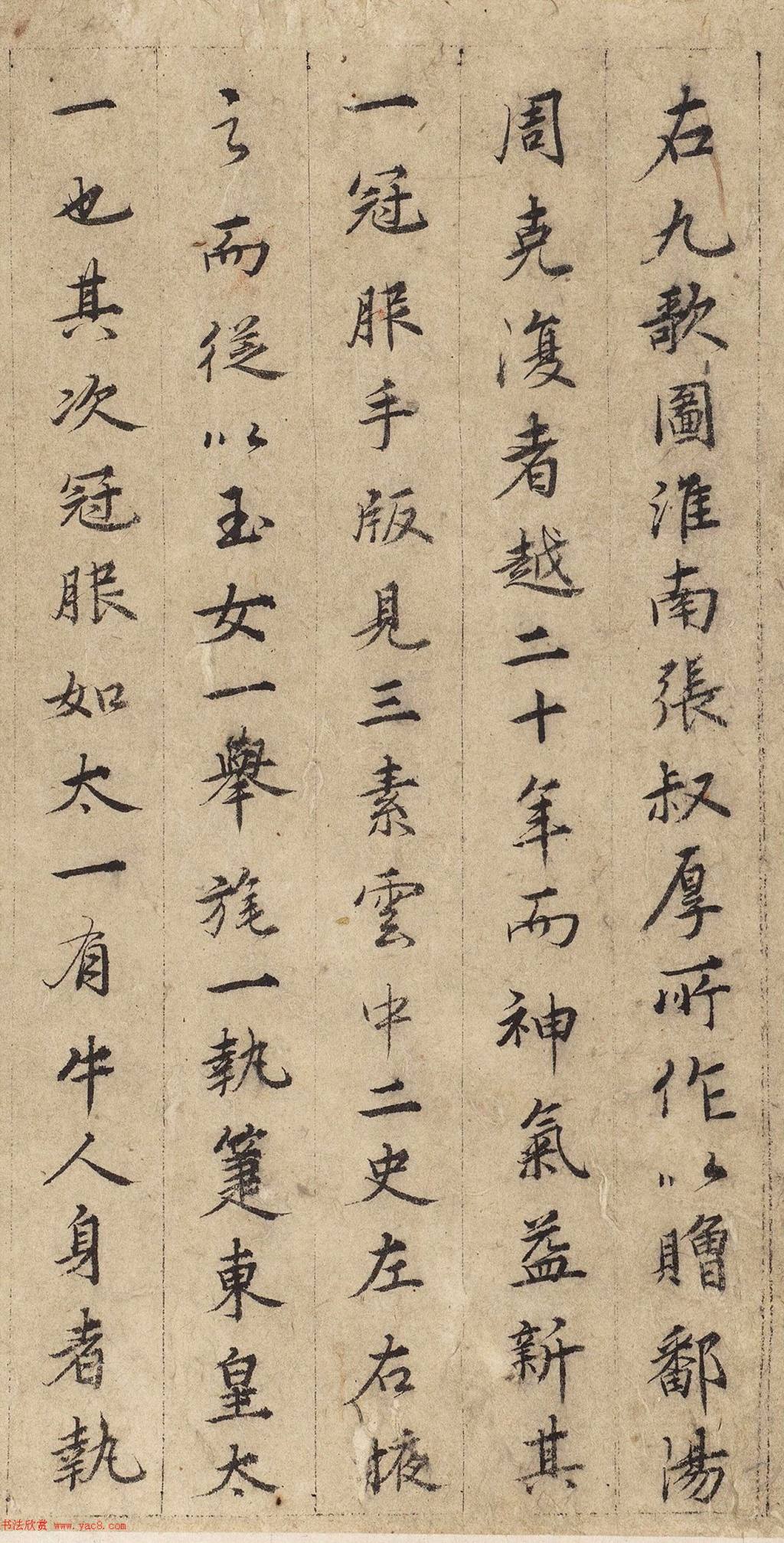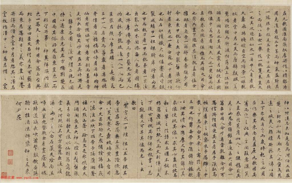 《九歌》由屈原所作,具有浓厚的宗教祭祀性质,祭祀的是楚国当时的九类自然神氏,共十一篇歌辞。本卷后题无书者姓名,传为张渥所作。