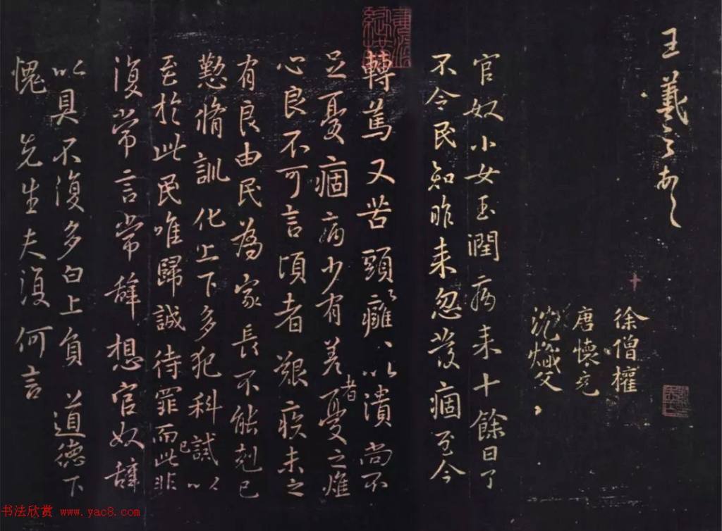 《官奴帖》释文:官奴小女玉润病来十余日,了不令民知。昨来忽发痼,至今转笃,又苦头痈,头痈以溃,尚不足忧。痼病少有差者,忧之燋心,良不可言。顷者艰疾,未之有良由。民为家长,不能克己,勤修训化,上下多犯科诫,以至于此。民唯归诚待罪而(已),此非复常言常辞。想官奴辞以具,不复多白。上负道德,下愧先生,夫复何言。